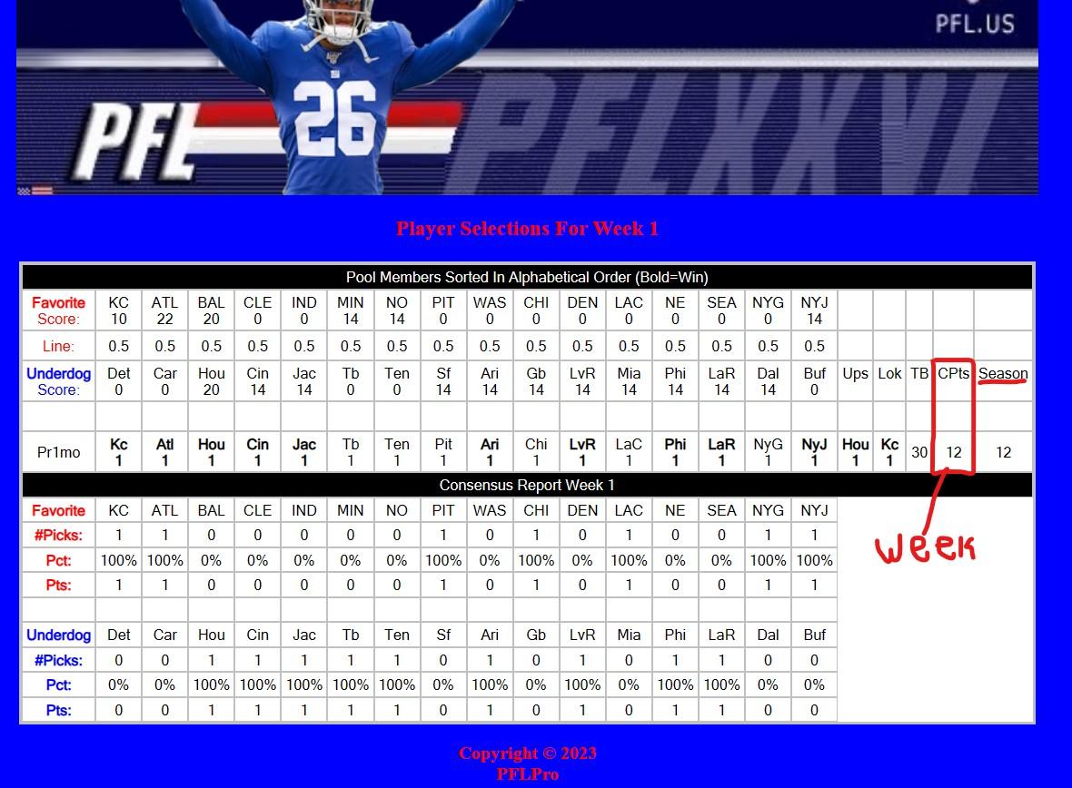 All PFL stats use the Cpts for the totals, this makes the lock and upset picks of the week extremely important, and extremely important to win the week or season stats.