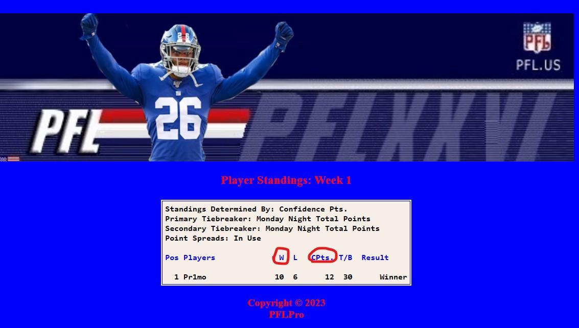 Finally, the weekly standings. This can be found under Standings, Weekly Standing (pfl.us/weekly.htm) or mobile device Season. This shows the results after the NFL games are complete. Using the example above: Pr1mo won 10 games and each game is worth 1 point, you will notice that under the Cpts. Pr1mo has a total of 12, this includes his Lock and Upset pick, which he won both this week. If he would have lost both his lock and upset picks, the Wins and Cpts would be the same amount.