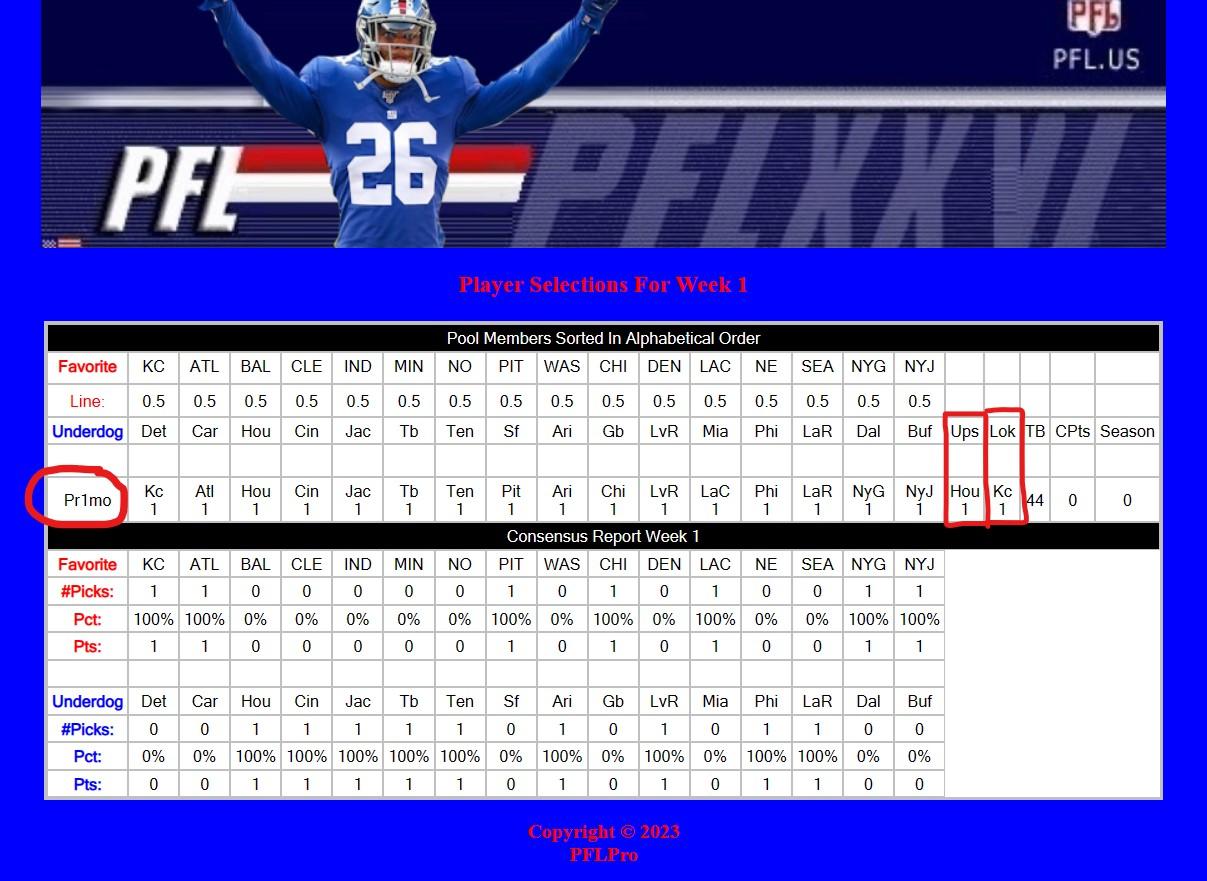 Players Picks: Each week after the Sunday 1:00 cutoff time, all players picks will be uploaded to the website. If you look under Picks: This Weeks Players Picks (pfl.us/picks.htm) or on our mobile link: Players Picks. You will see every players picks for the week. For example, this is Pr1mo's picks, all his picks are preset with a 1 point under each team, there is also a 1 point under his Ups pick (Upset) and 1 point under his Lok pick (Lock). This is what the Picks page looks like before any games are played.